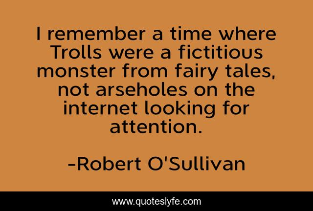 This page presents the quote "I remember a time where Trolls were a fictitious monster from fairy tales, not arseholes on the internet looking for attention.". Author of this quote is Robert O'Sullivan. This quote is about troll, monster, internet,.