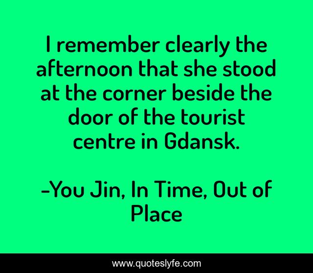 This page presents the quote "I remember clearly the afternoon that she stood at the corner beside the door of the tourist centre in Gdansk.". Author of this quote is You Jin, In Time, Out of Place. This quote is about sg-lit, epigram-books, singapore, poland, in-time-out-of-place, fiction, sglit, short-stories, short-story,.