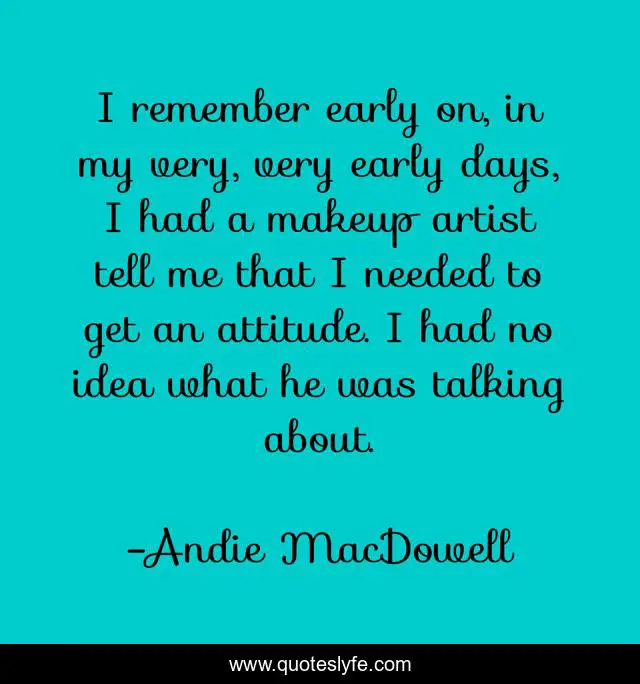 This page presents the quote "I remember early on, in my very, very early days, I had a makeup artist tell me that I needed to get an attitude. I had no idea what he was talking about.". Author of this quote is Andie MacDowell. This quote is about me, makeup, artist,.