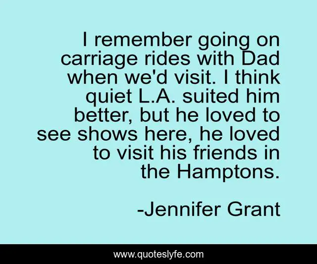 This page presents the quote "I remember going on carriage rides with Dad when we'd visit. I think quiet L.A. suited him better, but he loved to see shows here, he loved to visit his friends in the Hamptons.". Author of this quote is Jennifer Grant. This quote is about friends, remember, think,.
