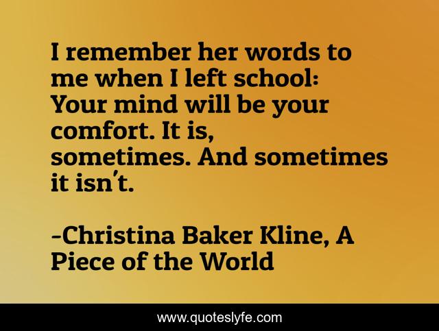 This page presents the quote "I remember her words to me when I left school: Your mind will be your comfort. It is, sometimes. And sometimes it isn't.". Author of this quote is Christina Baker Kline, A Piece of the World. This quote is about discomfort, comfort, mind,.