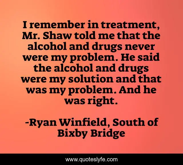 This page presents the quote "I remember in treatment, Mr. Shaw told me that the alcohol and drugs never were my problem. He said the alcohol and drugs were my solution and that was my problem. And he was right.". Author of this quote is Ryan Winfield, South of Bixby Bridge. This quote is about enthusiasm, despair, inspirational, life-lessons, hope,.