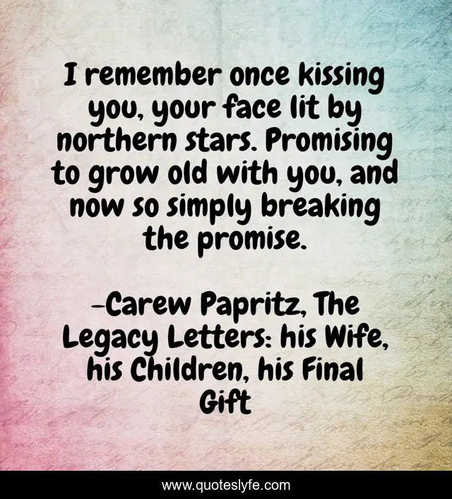 This page presents the quote "I remember once kissing you, your face lit by northern stars. Promising to grow old with you, and now so simply breaking the promise.". Author of this quote is Carew Papritz, The Legacy Letters: his Wife, his Children, his Final Gift. This quote is about carew-papritz, quote, promise-to-grow-old, kissing-you, quotes, the-legacy-letters, stars, breaking-the-promise,.