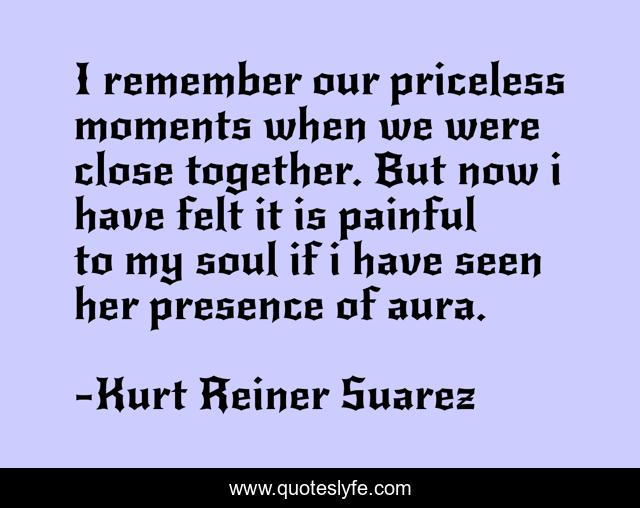 This page presents the quote "I remember our priceless moments when we were close together. But now i have felt it is painful to my soul if i have seen her presence of aura.". Author of this quote is Kurt Reiner Suarez. This quote is about remember, presence, soul, moment, aura, time, painful,.