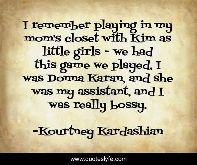 This page presents the quote "I remember playing in my mom's closet with Kim as little girls - we had this game we played, I was Donna Karan, and she was my assistant, and I was really bossy.". Author of this quote is Kourtney Kardashian. This quote is about little girls, game, remember,.