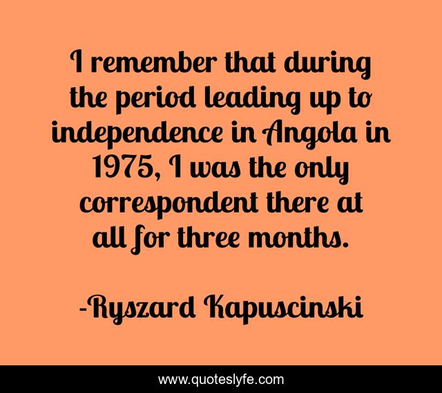This page presents the quote "I remember that during the period leading up to independence in Angola in 1975, I was the only correspondent there at all for three months.". Author of this quote is Ryszard Kapuscinski. This quote is about three, up, remember,.