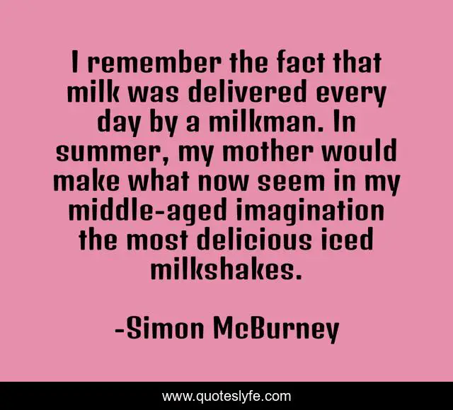 This page presents the quote "I remember the fact that milk was delivered every day by a milkman. In summer, my mother would make what now seem in my middle-aged imagination the most delicious iced milkshakes.". Author of this quote is Simon McBurney. This quote is about mother, remember, day,.