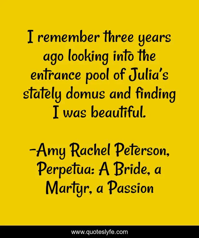 This page presents the quote "I remember three years ago looking into the entrance pool of Julia’s stately domus and finding I was beautiful.". Author of this quote is Amy Rachel Peterson, Perpetua: A Bride, a Martyr, a Passion. This quote is about beautiful, perpetua, beauty,.