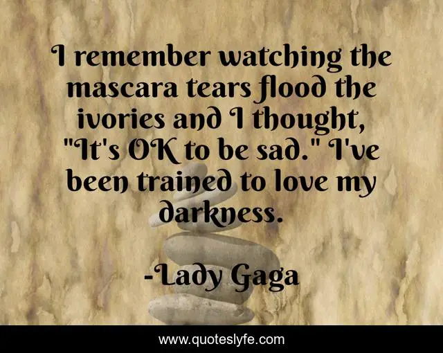 This page presents the quote "I remember watching the mascara tears flood the ivories and I thought, "It's OK to be sad." I've been trained to love my darkness.". Author of this quote is Lady Gaga. .