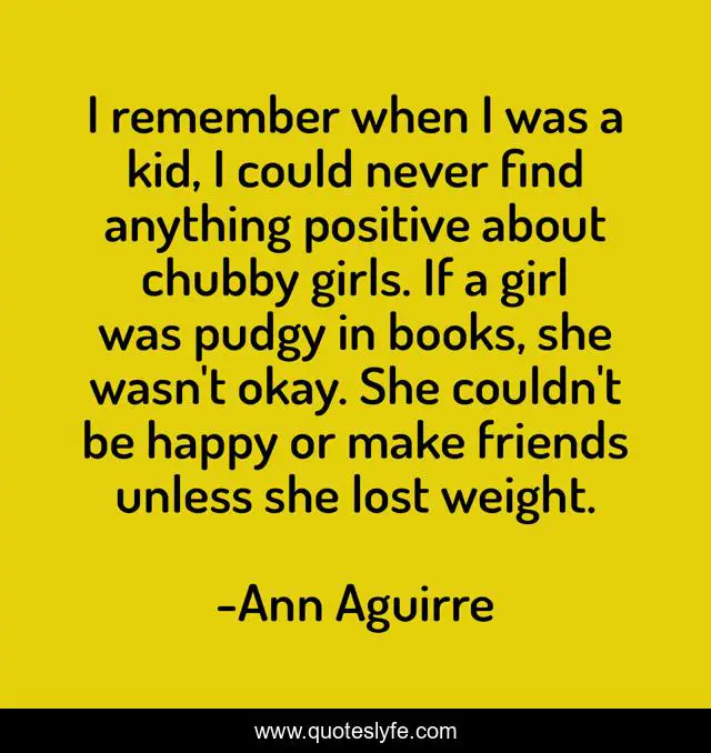 This page presents the quote "I remember when I was a kid, I could never find anything positive about chubby girls. If a girl was pudgy in books, she wasn't okay. She couldn't be happy or make friends unless she lost weight.". Author of this quote is Ann Aguirre. This quote is about girl, friends, happy,.