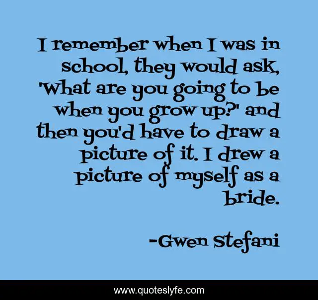 This page presents the quote "I remember when I was in school, they would ask, 'What are you going to be when you grow up?' and then you'd have to draw a picture of it. I drew a picture of myself as a bride.". Author of this quote is Gwen Stefani. This quote is about myself, school, remember,.