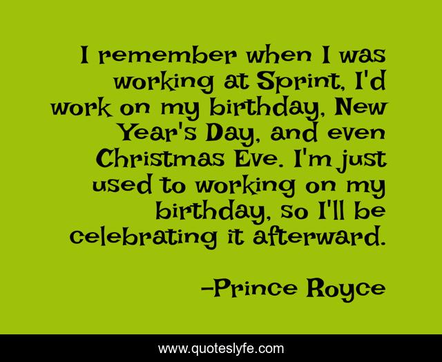 This page presents the quote "I remember when I was working at Sprint, I'd work on my birthday, New Year's Day, and even Christmas Eve. I'm just used to working on my birthday, so I'll be celebrating it afterward.". Author of this quote is Prince Royce. This quote is about work, day, birthday,.