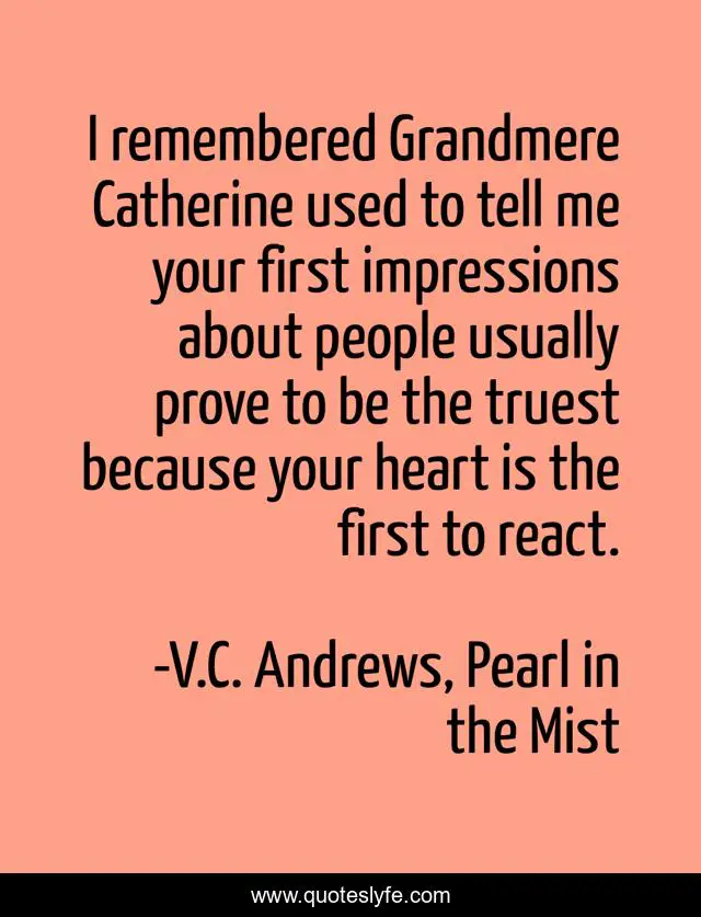 This page presents the quote "I remembered Grandmere Catherine used to tell me your first impressions about people usually prove to be the truest because your heart is the first to react.". Author of this quote is V.C. Andrews, Pearl in the Mist. This quote is about reactions, heart, landry, wisdom, 2, impressions, v-c-andrews, pearl-in-the-mist,.