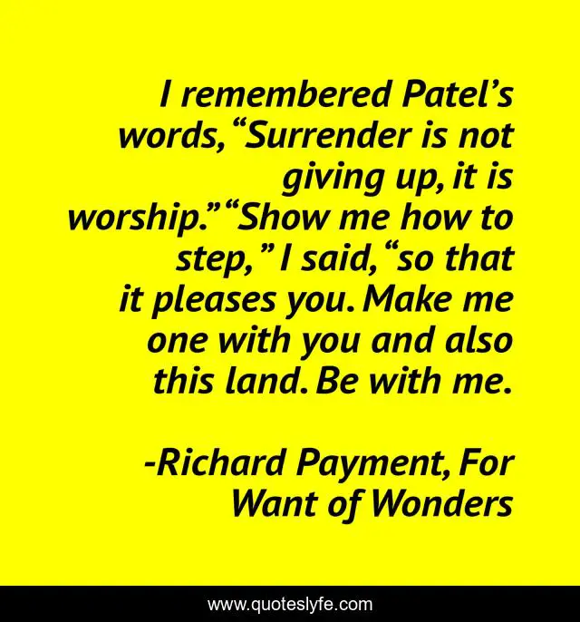 This page presents the quote "I remembered Patel’s words, “Surrender is not giving up, it is worship.” “Show me how to step, ” I said, “so that it pleases you. Make me one with you and also this land. Be with me.". Author of this quote is Richard Payment, For Want of Wonders. This quote is about surrender, worship,.