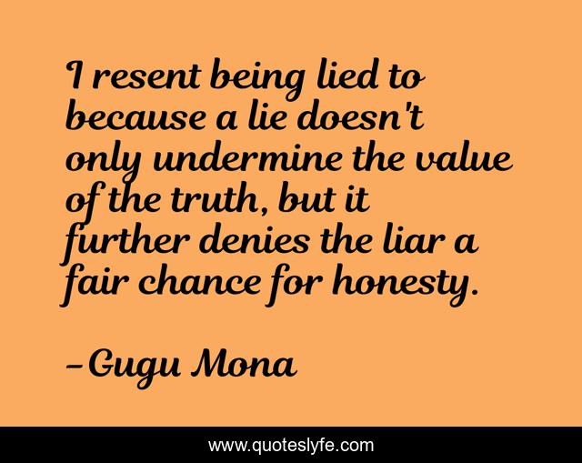 This page presents the quote "I resent being lied to because a lie doesn't only undermine the value of the truth, but it further denies the liar a fair chance for honesty.". Author of this quote is Gugu Mona. This quote is about lie, liar, honesty, lied, value, resent, chance, truth, undermine,.