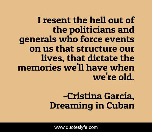 This page presents the quote "I resent the hell out of the politicians and generals who force events on us that structure our lives, that dictate the memories we'll have when we're old.". Author of this quote is Cristina García, Dreaming in Cuban. This quote is about politics, cuba, memory, cuban-revolution,.