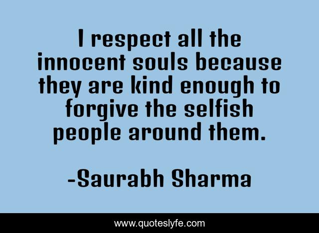 This page presents the quote "I respect all the innocent souls because they are kind enough to forgive the selfish people around them.". Author of this quote is Saurabh Sharma. This quote is about selfishness, enthusiasm, forgiveness, innocent, inspirational,.