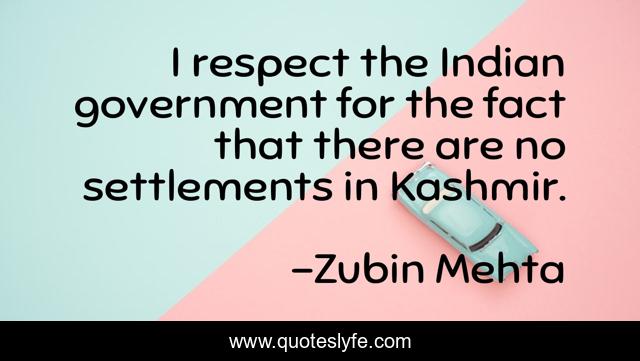 This page presents the quote "I respect the Indian government for the fact that there are no settlements in Kashmir.". Author of this quote is Zubin Mehta. This quote is about indian, fact, government,.