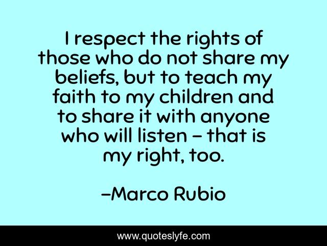This page presents the quote "I respect the rights of those who do not share my beliefs, but to teach my faith to my children and to share it with anyone who will listen - that is my right, too.". Author of this quote is Marco Rubio. This quote is about faith, children, listen,.
