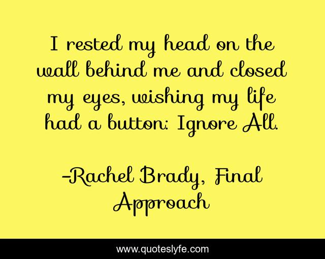 This page presents the quote "I rested my head on the wall behind me and closed my eyes, wishing my life had a button: Ignore All.". Author of this quote is Rachel Brady, Final Approach. This quote is about mystery, skydiving, murder, sleuth,.