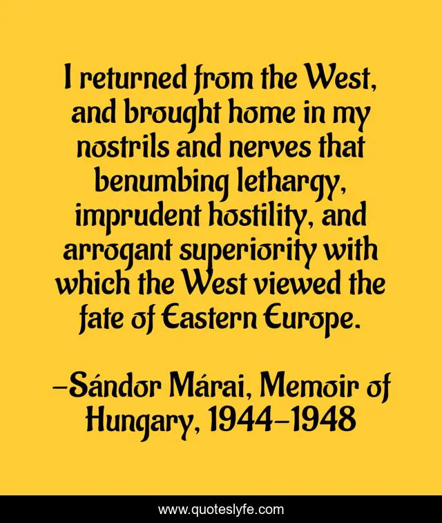 This page presents the quote "I returned from the West, and brought home in my nostrils and nerves that benumbing lethargy, imprudent hostility, and arrogant superiority with which the West viewed the fate of Eastern Europe.". Author of this quote is Sándor Márai, Memoir of Hungary, 1944-1948. This quote is about western-gaze, cold-war, eastern-europe, history,.