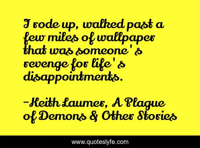 This page presents the quote "I rode up, walked past a few miles of wallpaper that was someone's revenge for life's disappointments.". Author of this quote is Keith Laumer, A Plague of Demons & Other Stories. This quote is about wallpaper, disappointment, revenge,.
