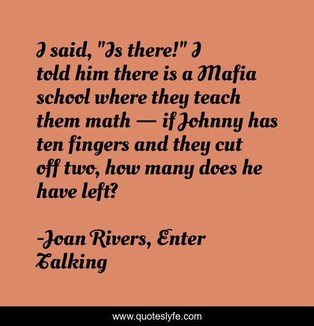 This page presents the quote "I said, "Is there!" I told him there is a Mafia school where they teach them math — if Johnny has ten fingers and they cut off two, how many does he have left?". Author of this quote is Joan Rivers, Enter Talking. This quote is about humour, performers, writing, brooklyn, nyc, comedy,.