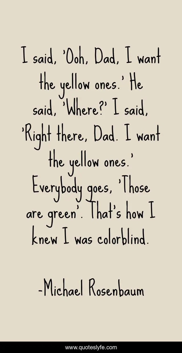 This page presents the quote "I said, 'Ooh, Dad, I want the yellow ones.' He said, 'Where?' I said, 'Right there, Dad. I want the yellow ones.' Everybody goes, 'Those are green'. That's how I knew I was colorblind.". Author of this quote is Michael Rosenbaum. This quote is about green, yellow,.