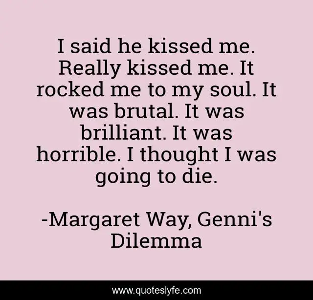 This page presents the quote "I said he kissed me. Really kissed me. It rocked me to my soul. It was brutal. It was brilliant. It was horrible. I thought I was going to die.". Author of this quote is Margaret Way, Genni's Dilemma. This quote is about kissing, kisses, kiss,.