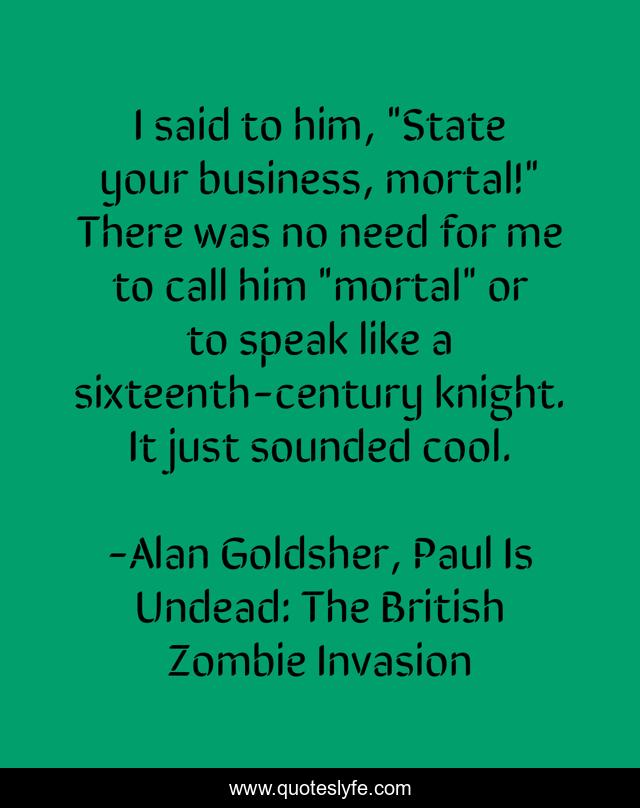 This page presents the quote "I said to him, "State your business, mortal!" There was no need for me to call him "mortal" or to speak like a sixteenth-century knight. It just sounded cool.". Author of this quote is Alan Goldsher, Paul Is Undead: The British Zombie Invasion. This quote is about paul-is-undead, beatles, zombies,.