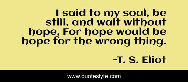 This page presents the quote "I said to my soul, be still, and wait without hope, For hope would be hope for the wrong thing.". Author of this quote is T. S. Eliot. This quote is about said, my soul, soul,.