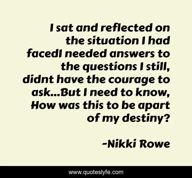 This page presents the quote "I sat and reflected on the situation I had facedI needed answers to the questions I still, didnt have the courage to ask...But I need to know, How was this to be apart of my destiny?". Author of this quote is Nikki Rowe. This quote is about life, wise-words, life-lessons, question, empowerment, struggle, words-of-wisdom, quotes-to-live-by, injury,.