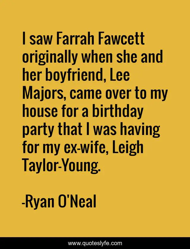 This page presents the quote "I saw Farrah Fawcett originally when she and her boyfriend, Lee Majors, came over to my house for a birthday party that I was having for my ex-wife, Leigh Taylor-Young.". Author of this quote is Ryan O'Neal. This quote is about party, she, her,.