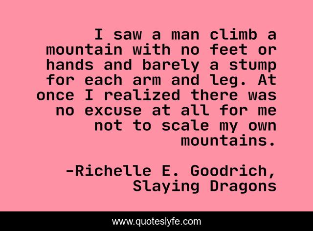 This page presents the quote "I saw a man climb a mountain with no feet or hands and barely a stump for each arm and leg. At once I realized there was no excuse at all for me not to scale my own mountains.". Author of this quote is Richelle E. Goodrich, Slaying Dragons. This quote is about perseverance, life, richelle-e-goodrich, behaviour, attitude, richelle, goals, inspirational, richelle-goodrich,.