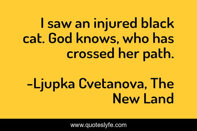 This page presents the quote "I saw an injured black cat. God knows, who has crossed her path.". Author of this quote is Ljupka Cvetanova, The New Land. This quote is about injured, black-cat, injure, quote, irony, cross-paths, bad-luck, aphorism, irony-of-life,.