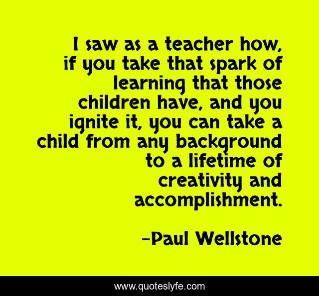 This page presents the quote "I saw as a teacher how, if you take that spark of learning that those children have, and you ignite it, you can take a child from any background to a lifetime of creativity and accomplishment.". Author of this quote is Paul Wellstone. This quote is about children, learning,.