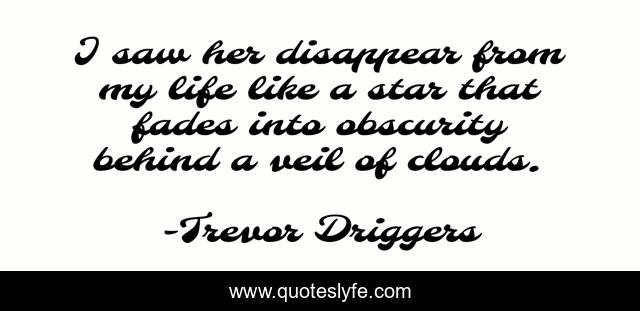 This page presents the quote "I saw her disappear from my life like a star that fades into obscurity behind a veil of clouds.". Author of this quote is Trevor Driggers. This quote is about loss, love, lost-love, goodbyes, loved-ones, sadness, losing-loved-one, affection, loving,.