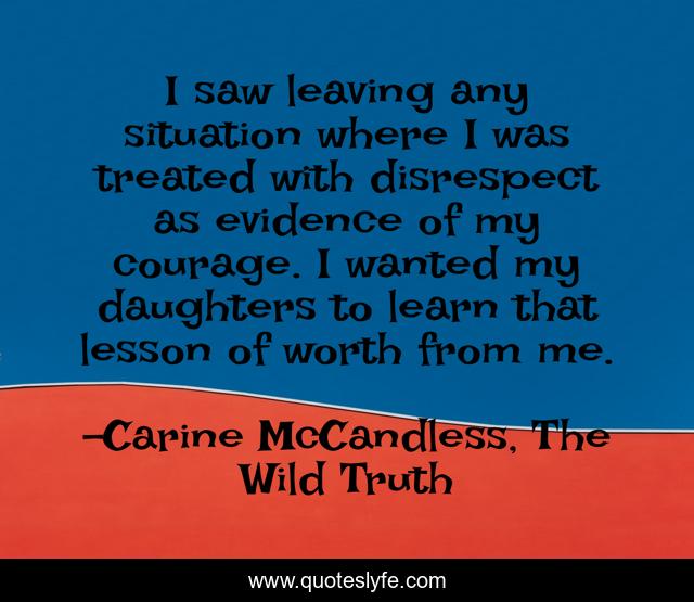 This page presents the quote "I saw leaving any situation where I was treated with disrespect as evidence of my courage. I wanted my daughters to learn that lesson of worth from me.". Author of this quote is Carine McCandless, The Wild Truth. This quote is about respect, courage, abuse,.