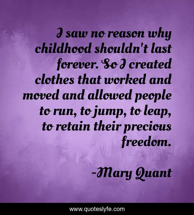 This page presents the quote "I saw no reason why childhood shouldn't last forever. So I created clothes that worked and moved and allowed people to run, to jump, to leap, to retain their precious freedom.". Author of this quote is Mary Quant. This quote is about people, childhood, clothes,.