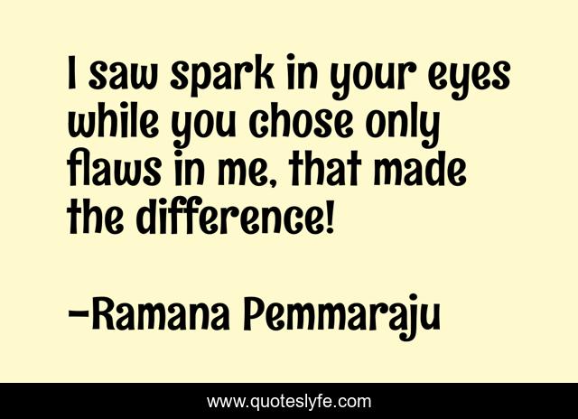 This page presents the quote "I saw spark in your eyes while you chose only flaws in me, that made the difference!". Author of this quote is Ramana Pemmaraju. This quote is about love, flaws-in-society, affection,.