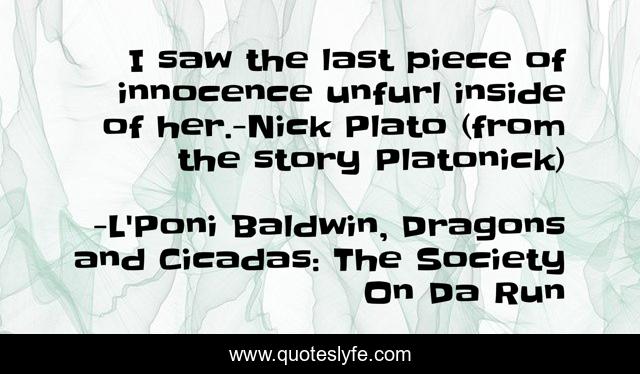 This page presents the quote "I saw the last piece of innocence unfurl inside of her.-Nick Plato (from the story Platonick)". Author of this quote is L'Poni Baldwin, Dragons and Cicadas: The Society On Da Run. This quote is about bwwm, dragons, romance, interracial, interracial-romance, lolita,.