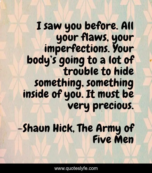 This page presents the quote "I saw you before. All your flaws, your imperfections. Your body’s going to a lot of trouble to hide something, something inside of you. It must be very precious.". Author of this quote is Shaun Hick, The Army of Five Men. This quote is about beautiful, inner-beauty, flaw, deception, beauty, flaws, appearances, mask, beautiful-inside,.