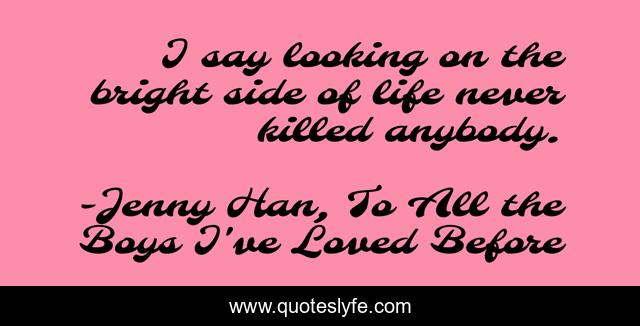This page presents the quote "I say looking on the bright side of life never killed anybody.". Author of this quote is Jenny Han, To All the Boys I've Loved Before. This quote is about confidence, good-vibes, positive, positivity, optimism, optimistic, optimist,.