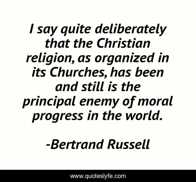 This page presents the quote "I say quite deliberately that the Christian religion, as organized in its Churches, has been and still is the principal enemy of moral progress in the world.". Author of this quote is Bertrand Russell. This quote is about progress, christian, world,.