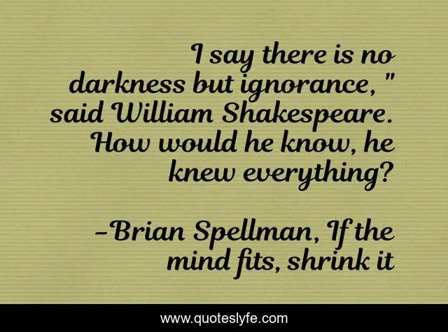 This page presents the quote "I say there is no darkness but ignorance, " said William Shakespeare. How would he know, he knew everything?". Author of this quote is Brian Spellman, If the mind fits, shrink it. This quote is about shakespeare, wisdom,.