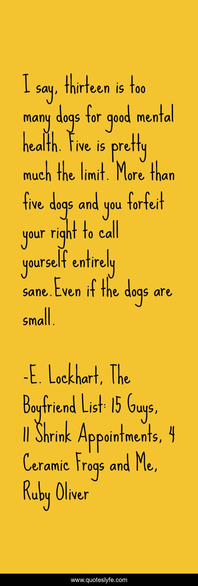 This page presents the quote "I say, thirteen is too many dogs for good mental health. Five is pretty much the limit. More than five dogs and you forfeit your right to call yourself entirely sane.Even if the dogs are small.". Author of this quote is E. Lockhart, The Boyfriend List: 15 Guys, 11 Shrink Appointments, 4 Ceramic Frogs and Me, Ruby Oliver. This quote is about sanity, psychotherapy, humor, dogs,.