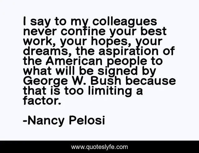 This page presents the quote "I say to my colleagues never confine your best work, your hopes, your dreams, the aspiration of the American people to what will be signed by George W. Bush because that is too limiting a factor.". Author of this quote is Nancy Pelosi. This quote is about american, work, best,.