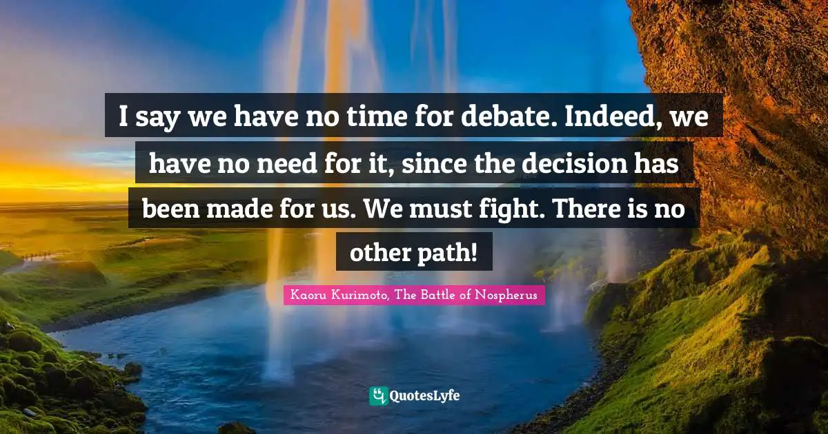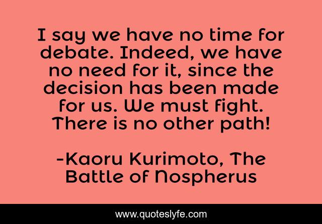 This page presents the quote "I say we have no time for debate. Indeed, we have no need for it, since the decision has been made for us. We must fight. There is no other path!". Author of this quote is Kaoru Kurimoto, The Battle of Nospherus. This quote is about nospherus, light-novel, kaoru-kurimoto, the-guin-saga, riyaad, guin, speech, battle, war,.