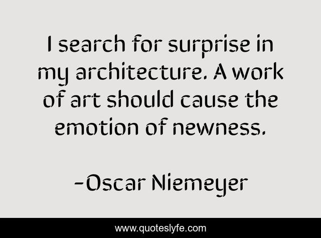 This page presents the quote "I search for surprise in my architecture. A work of art should cause the emotion of newness.". Author of this quote is Oscar Niemeyer. This quote is about surprise, work, art,.