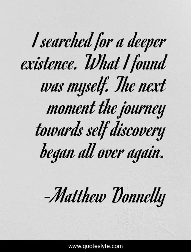This page presents the quote "I searched for a deeper existence. What I found was myself. The next moment the journey towards self discovery began all over again.". Author of this quote is Matthew Donnelly. This quote is about existence, journey, never-ending, self-discovery,.